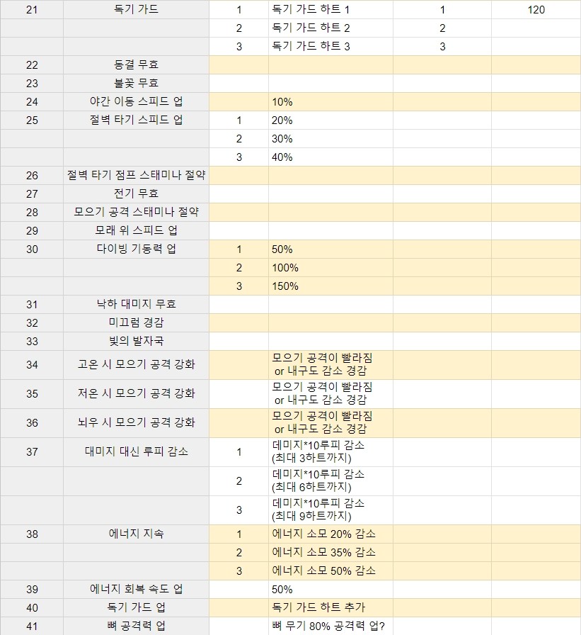 위 시트의 방어구/요리 효과를 정리하였습니다. 효과 이름은 정식 한국어 버전 용어입니다. 구글 시트로 보실 분은 아래로 가시면 됩니다.