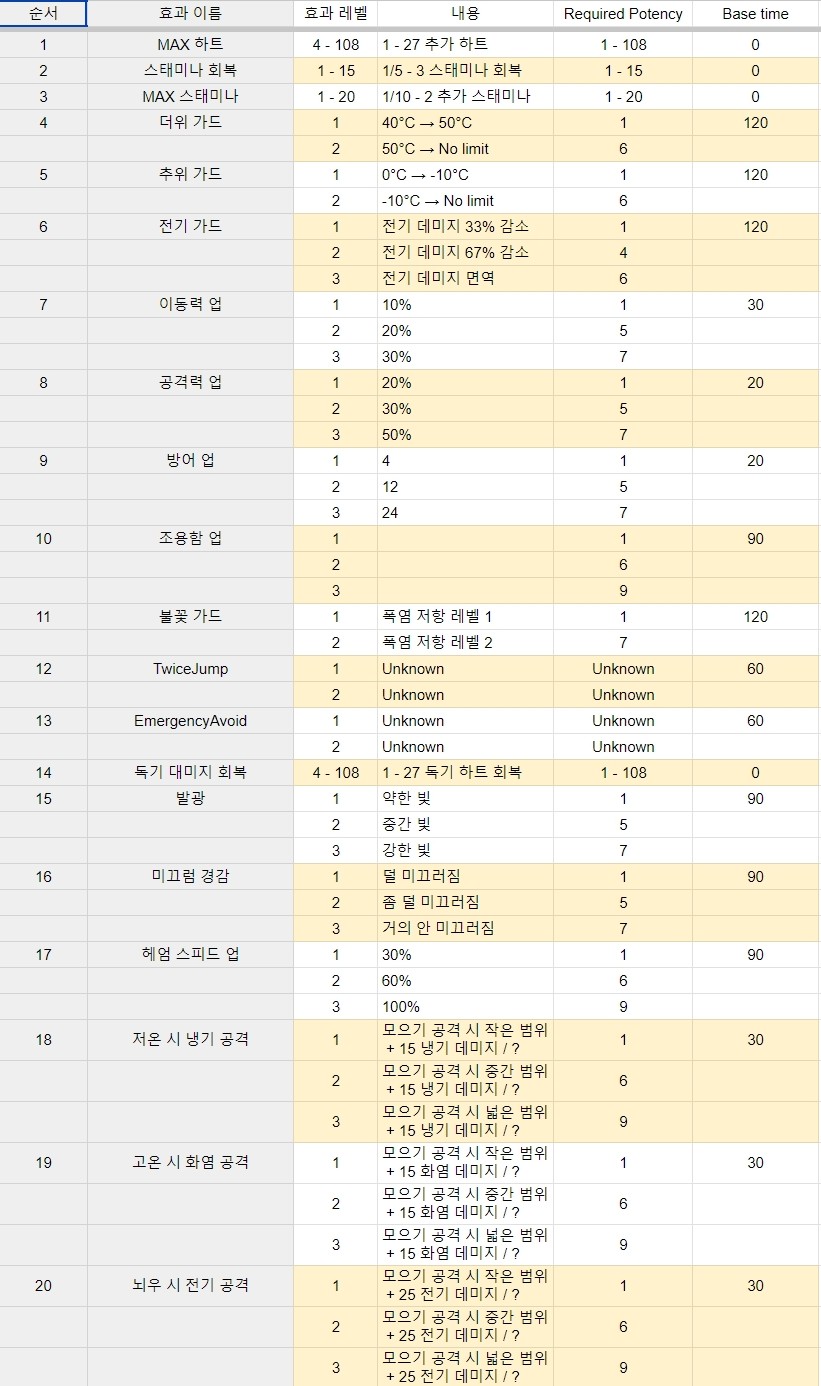 - 아래 테이블의 Required Potency 는 효과 레벨이 결정되는데 필요한 수치인 것 같습니다. 원 시트에서 effect level 열의 값이 여기의 potency 값이 아닐까 싶은데, 문제는 이 시트에서도 effect level 을 열 이름으로 썼고, 아래에 "효과 레벨"로 번역해놓은 상태입니다. 이 부분은 추가 확인이 필요합니다.
